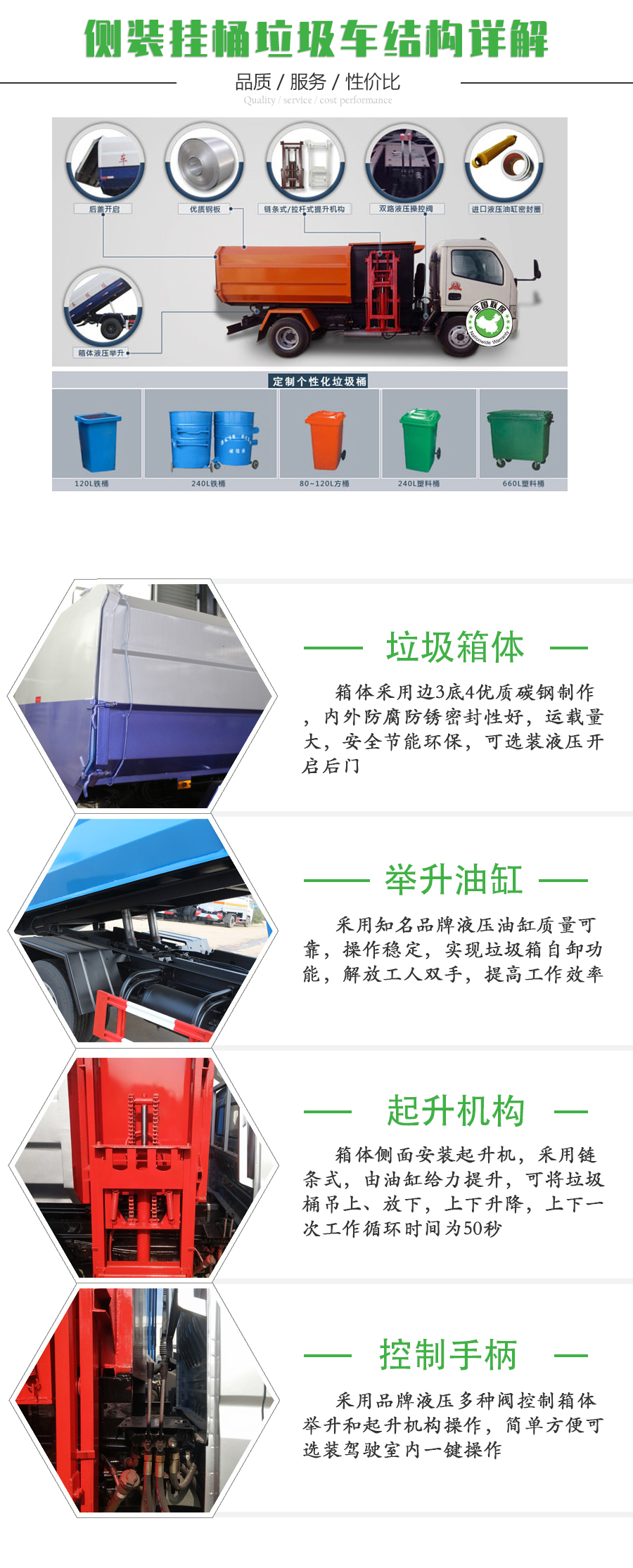 自動舉升垃圾桶倒入垃圾,提升機頂部帶機械翻蓋,箱體底部雙液壓舉升自卸,液壓系統控制提升機上升+下降+自卸作業,箱體后部設有擋水槽,尾部裝有橡膠密封條,防污水滴漏。適用于城鄉街道垃圾桶、生活區垃圾桶、工業園區垃圾桶的垃圾收集轉運。