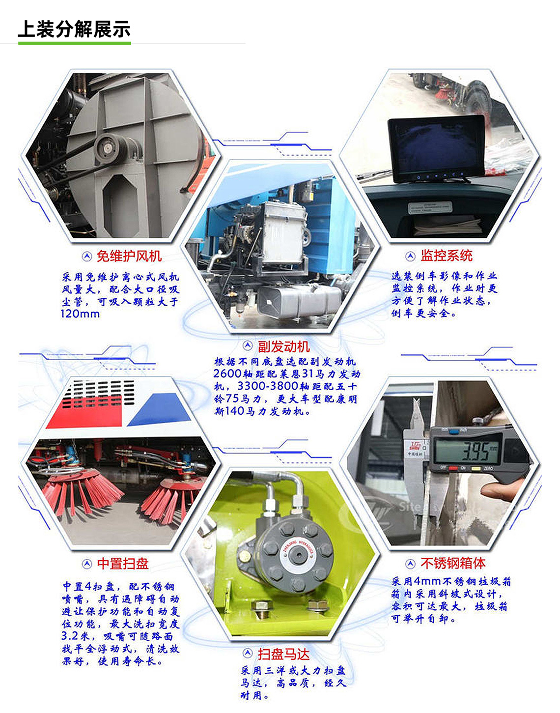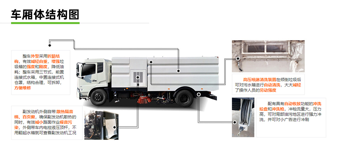 帶掃盤4把,江鈴副發(fā)動機;大力馬達;施耐德控件開關;臺灣電磁閥組;免維護自分離式離合器;免維護風機;不銹鋼水箱;不銹鋼垃圾箱;尾部LED箭頭燈;手動泵應急系統(tǒng);刷臂轉動機構使用高新耐磨工程隔套,免打黃油;精密冷彎無縫液壓油管。
