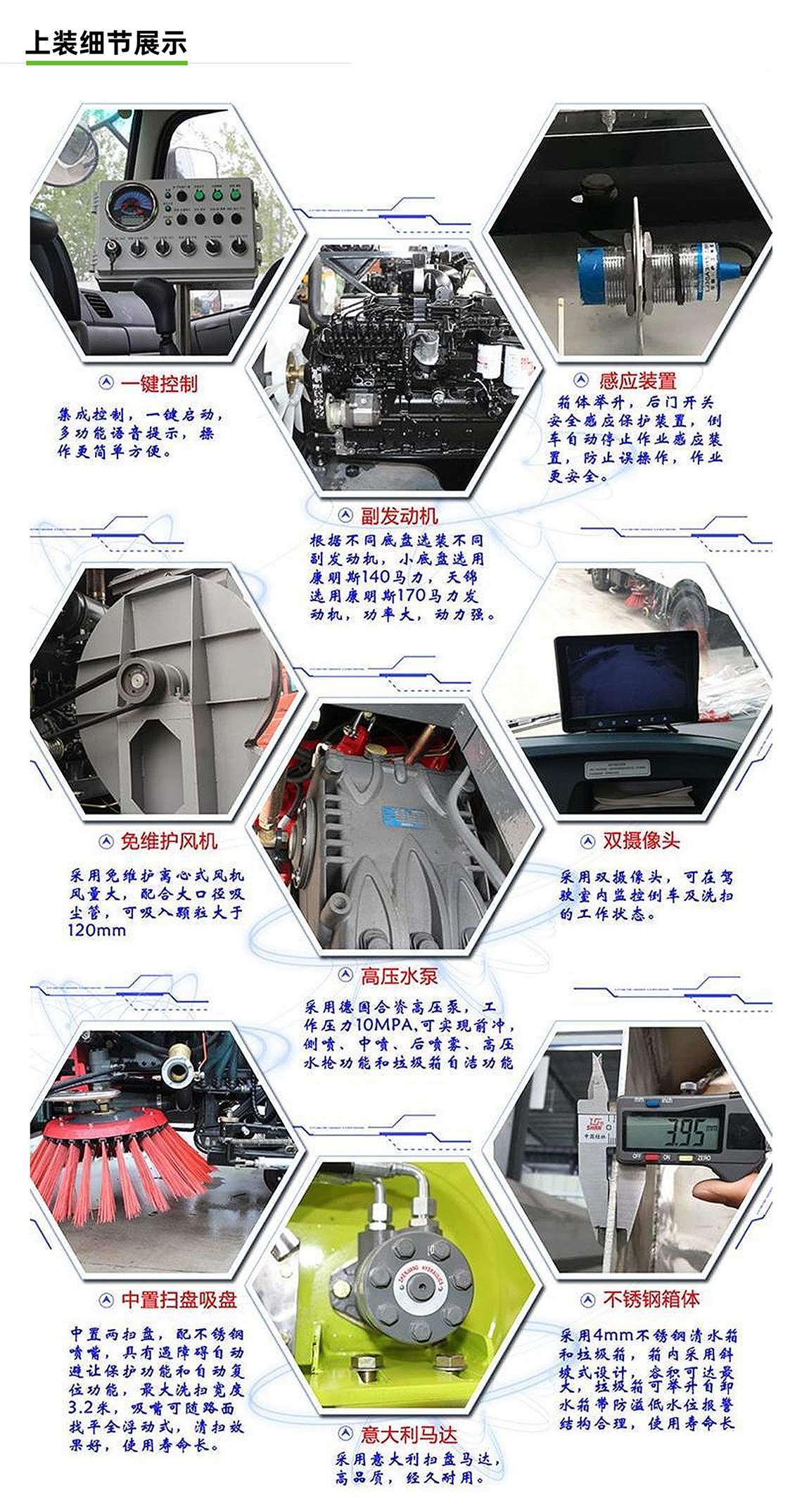 3:在一鍵控制技術基礎上增加副發動機手動油門控制系統,可根據路況獨立調節油門大小,有效增強洗掃效果,減少油耗。